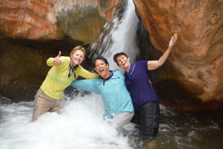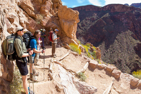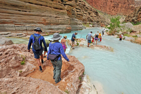 Because of the difficulty of the mandatory hike into the canyon, you must call us to book — we do not take online reservations for hike-intensive trips. We’ll want to talk to you, and everyone in your group, about your hiking experience, your current fitness level and exercise routine, how to train and prepare for this hike, and any medical conditions that might affect your ability to get the most out of this experience. We do not recommend this trip for people with a history of heart problems, high susceptibility to heat-related illness or exercise-induced asthma. Other factors that may negatively impact your hike include being out of shape, overweight, or a smoker.