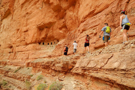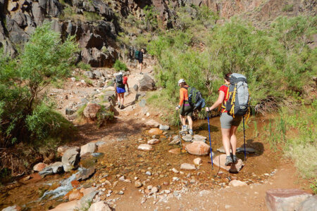 Because of the difficulty of this mandatory hike out of the canyon, you must call us to book — online reservations are not allowed. We’ll want to talk to you, and everyone in your group, about your hiking experience, your current fitness level and routine, how to train and prepare for this hike, and any medical conditions that might affect your ability to get the most out of this experience. We do not recommend this trip for people with a history of heart problems, high susceptibility to heat-related illness or exercise-induced asthma. Other factors, including being out of shape, overweight, or a smoker, also may negatively impact your hike.